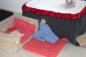| Wenn die Kittenbabys beginnen aus der Wurfkiste rauszuklettern, bauen wir einen Verschlag um die Wurfkiste. Dieses Laufgehäge ist "2 m breit und 3,5 m" lang und besitzt mehrere Katzentoiletten und einen kittengerechten Kratzbaum der genug Möglichkeiten bietet um zu spielen und darauf zu schlafen. | |||||